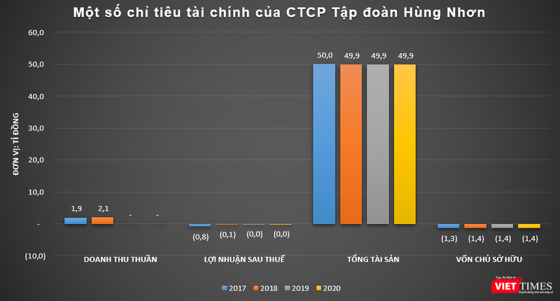 Dữ liệu của VietTimes thể hiện, Hùng Nhơn đã không phát sinh doanh thu trong các năm 2019 và 2020, đồng thời cũng báo lỗ nhẹ trong giai đoạn này. Trước đó, dù có phát sinh doanh thu vào các năm 2017 và 2018, song Hùng Nhơn đều báo lỗ, lần lượt ở mức 0,8 tỉ đồng và 0,082 tỉ đồng.