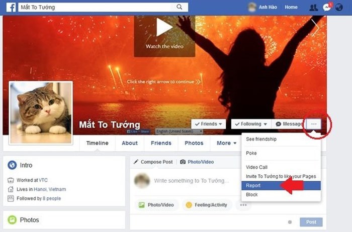Khi phát hiện ra tài khoản Facebook mạo danh, chúng ta có thể vào tài khoản đó để báo cáo bằng cách bấm nút 3 chấm trên khung ảnh bìa rồi chọn Report.