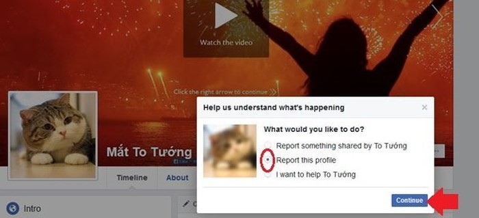Đánh dấu "Report this profile" và bấm Continue để báo cáo về tài khoản.