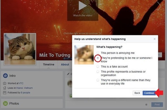 Lựa chọn một nguyên nhân đúng với trường hợp của bạn, ví dụ như "They're pretending to be me or someone I know", rồi bấm Continue. Sau đó hãy làm theo chỉ dẫn của Facebook các bước tiếp theo, khi báo cáo chúng ta có thể cần gửi ảnh chụp giấy tờ tùy thân để Facebook xac minh.