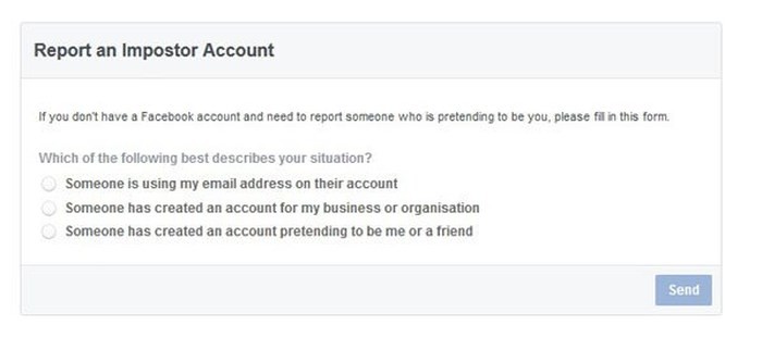 Trong trường hợp chúng ta bị mạo danh trên Facebook trong khi không dùng tài khoản Facebook nào, hãy vào đây, và làm theo chỉ dẫn của Facebook. Khi báo cáo ở đây chúng ta cũng cần gửi ảnh chụp giấy tờ tùy thân để Facebook xac minh.