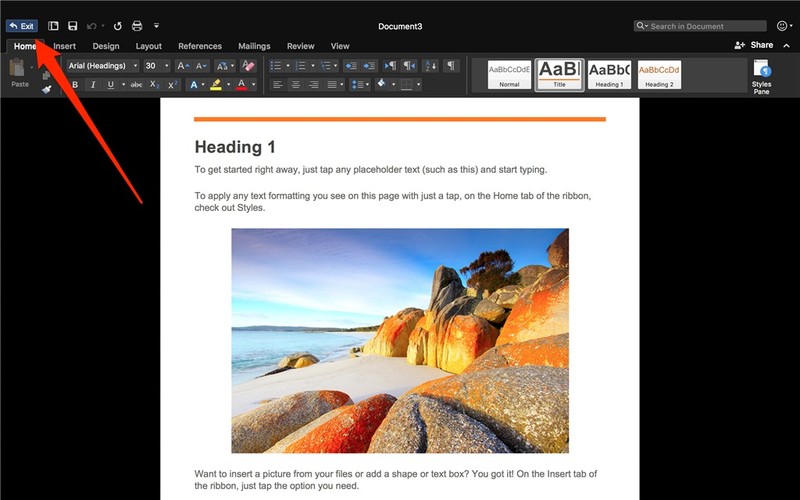 Bạn vẫn có thể truy cập vào các lệnh và các thiết lập của Word bằng cách rê con trỏ chuột lên trên cùng của cửa sổ. Khi muốn thoát khỏi chế độ Tập trung, bạn hãy nhấn phím Esc hoặc rê con trỏ chuột lên trên phía trên cùng, góc trái và chọn Exit.