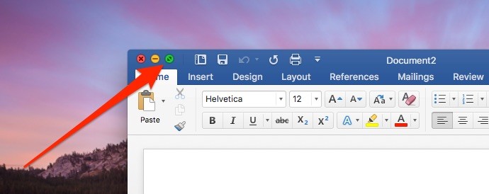 Nếu bạn đang sử dụng phiên bản Word 2016 cho Mac, Focus mode chính là chế độ toàn màn hình (Full-screen mode). Để kích hoạt nó, bạn chỉ cần nhấn nút hình hai mũi tên đối xứng (Maximize) ở phía trên, góc trái.