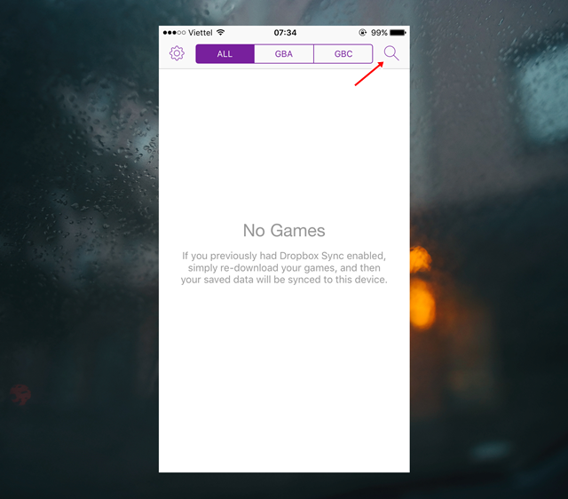 Bây giờ bạn hãy nhấp vào biểu tượng ứng dụng GBA4iOS ở Màn hình chính để khởi động ứng dụng. Khi đã hoàn tất khởi động, bạn hãy nhấp vào biểu tượng Tìm kiếm hình chiếc kính lúp.