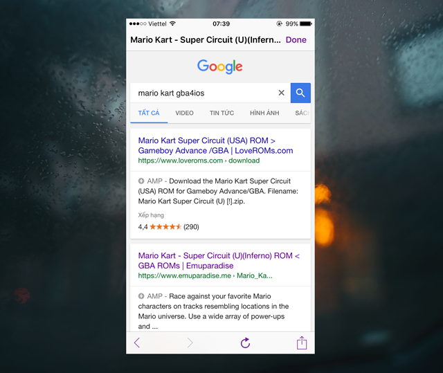 Tính năng duyệt web sẽ được mở ra và tự động truy cập vào trang tìm kiếm của Google. Lúc này, bạn hãy nhập từ khóa với tên tựa game mình muốn, kèm theo phía sau là từ “GBA4iOS” để có được trang web tải game.