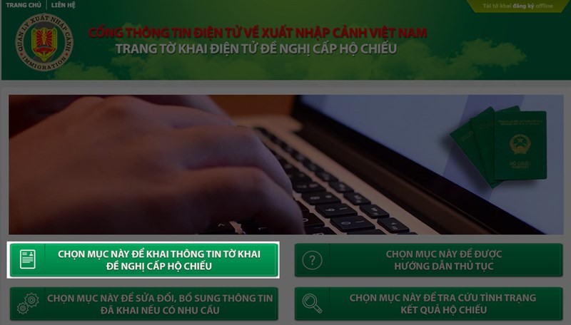 Các bạn vào website Cổng thông tin điện tử về xuất nhập cảnh Việt Nam có địa chỉ tại đây. Sau đó bấm vào mục Dịch vụ công trực tuyến nằm ở bên tay trái, tiếp tục nhấn vào Chọn mục này để khai thông tin tờ khai đề nghị cấp hộ chiếu.