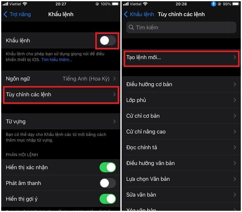 Bước 2 : Bạn gạt nút sang bên phải để Bật tính năng khẩu lệnh cho điện thoại của mình. Sau khi mở khẩu lệnh, bạn chọn vào mục Tùy chỉnh các lệnh > Chọn Tạo lệnh mới .