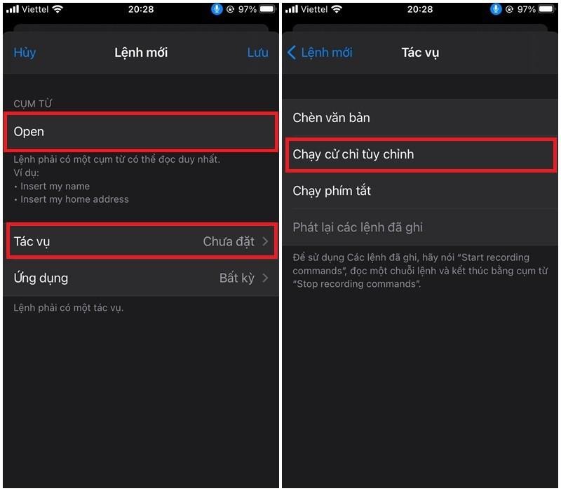 Bước 3 : Bạn nhập câu lệnh dùng để yêu cầu iPhone mở khóa tại mục Cụm từ ( Lưu ý : Câu lệnh áp dụng chỉ hỗ trợ tiếng Anh, tốt nhất nên chọn từ Open để cho thuận tiện nhất khi dùng). Sau đó bạn chọn vào Tác vụ > Chọn Chạy cử chỉ tùy chỉnh .