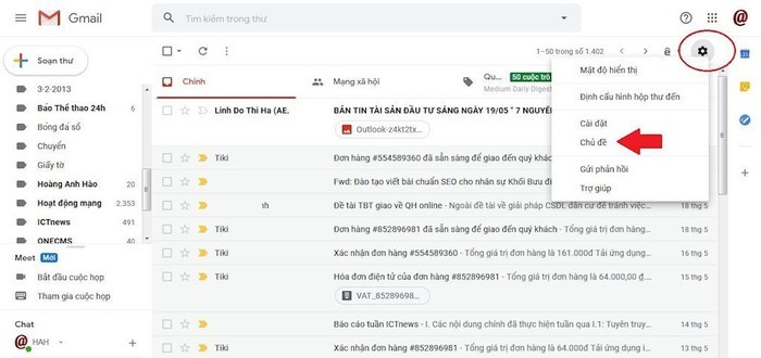 Khi sử dụng Gmail trên máy tính (mail.google.com), để chuyển đổi phông nền chúng ta bấm vào biểu tượng bánh răng cưa và chọn mục "Chủ đề" (Theme).