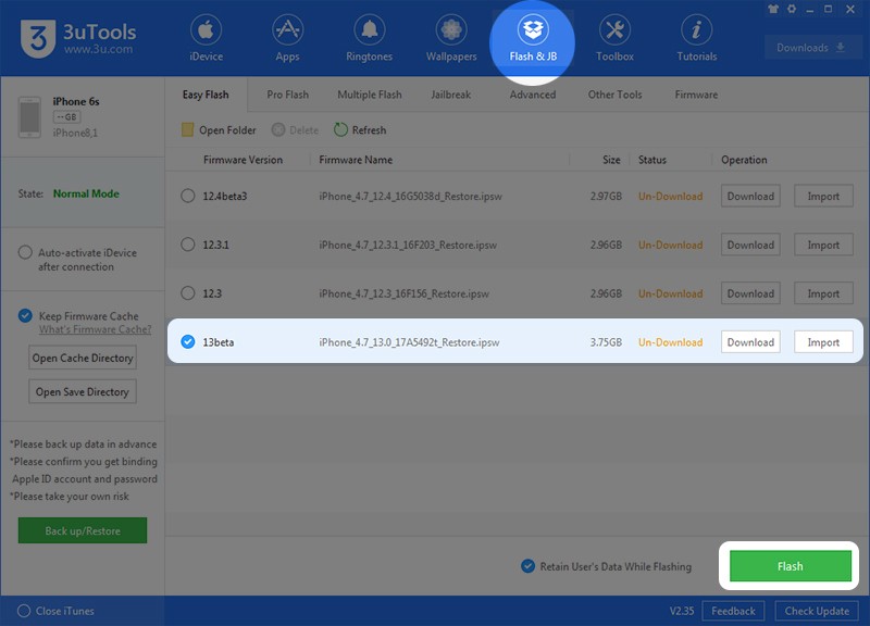 Bước 6: Nhấn vào Flash & JP như hình dưới dây. Tiếp tục chọn 13beta và nhấn nút Download. Lưu ý rằng, phiên bản iOS 13 beta có dung lượng khá lớn (3.75 GB), bạn nên kết nối mạng ổn định để đảm bảo tốc độ tải về nhanh chóng.