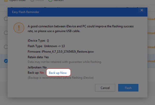 Bước 8: Trước khi cài đặt, 3uTools sẽ hỏi bạn có nên sao lưu dữ liệu hay không? Để hạn chế rủi ro trong quá trình cài đặt, bạn nên chọn Back up Now trước khi cài đặt iOS 13 beta nhé.