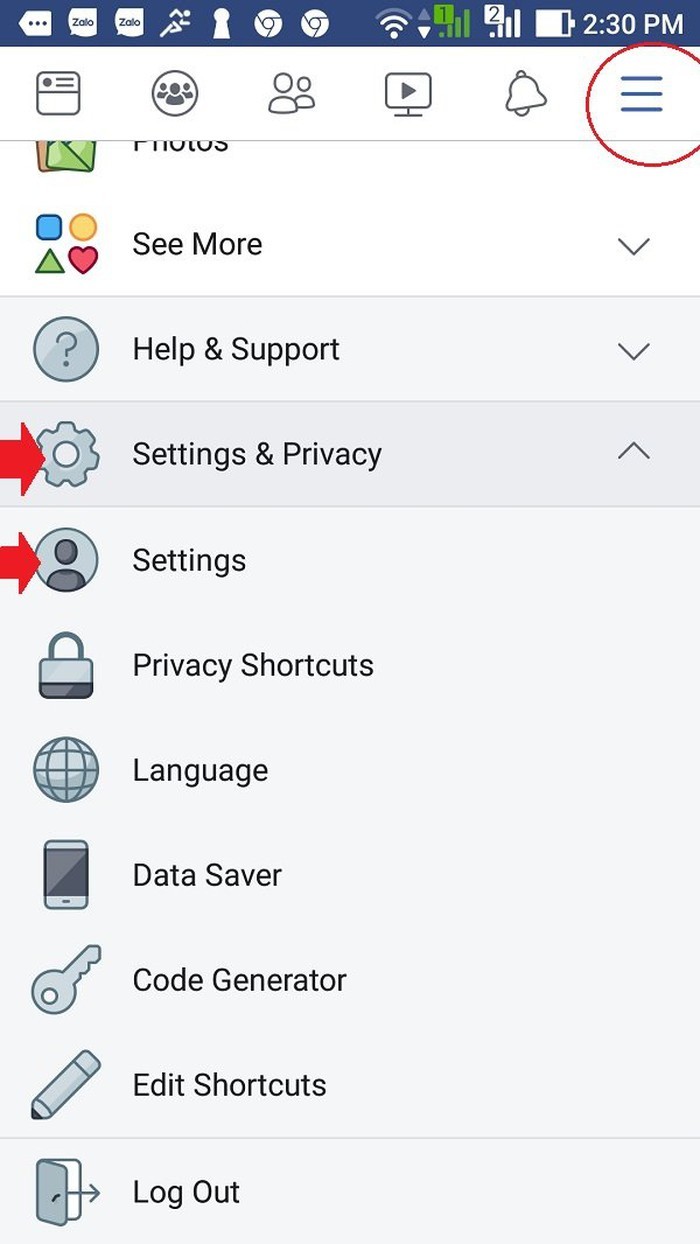 Trên ứng dụng Facebook chúng ta vào danh mục thêm ở góc trên bên phải rồi chọn Settings & Privacy => Settings.
