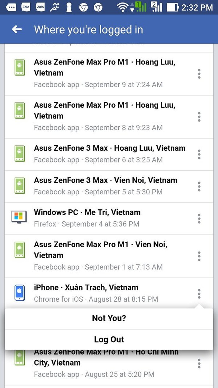 Nếu thấy phiên đăng nhập trên thiết bị nào chúng ta không thể nhớ ra, chúng ta có thể bấm dấu 3 chấm bên cạnh và chọn Log Out; nếu chắc chắn đó là thiết bị lạ thì chúng ta chọn Not You để thiết lập biện pháp an toàn.