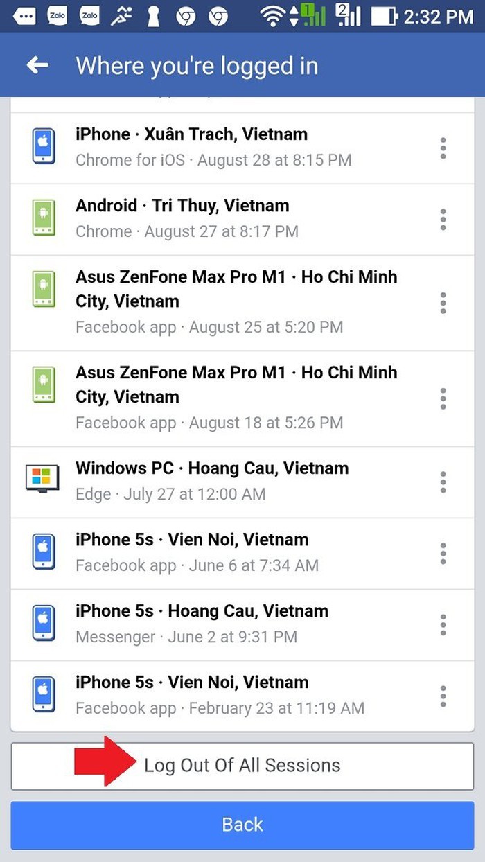Ngoài ra chúng ta có thể đăng xuất ra khỏi tất cả các thiết bị bằng cách kéo xuống dưới và chọn Log Out Of All Sessions.