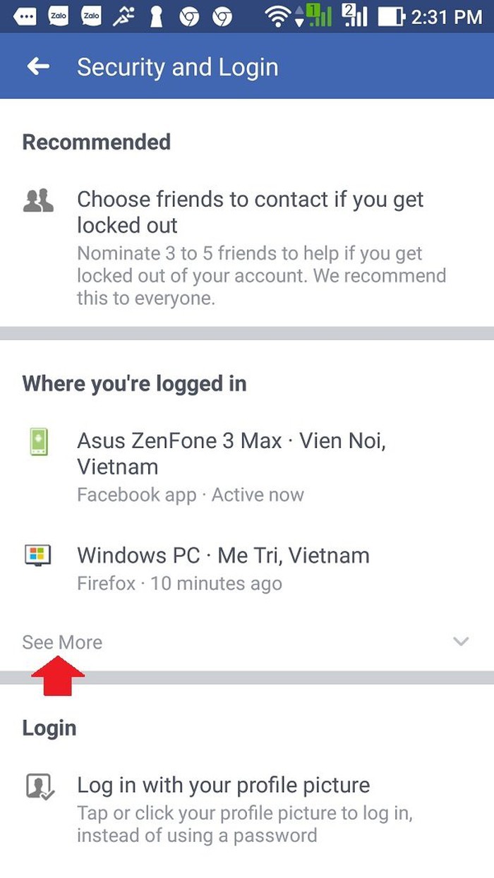 Trong danh sách "Where you're logged in" sẽ là các thiết bị đang đăng nhập bằng tài khoản của chúng ta. Hãy bấm See More để xem danh sách đầy đủ.