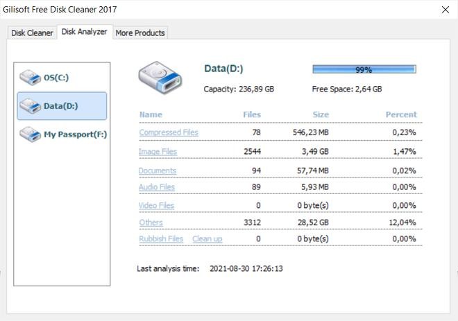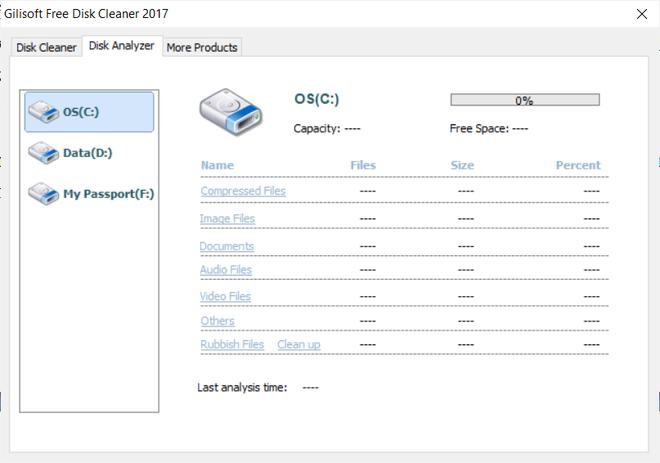 Ngoài chức năng dọn dẹp file rác, Gilisoft Free Disk Cleaner còn cho phép người dùng phân tích các phân vùng ổ cứng để biết được hiện trạng lưu trữ của các phân vùng, chẳng hạn như tổng số file đang có trên ổ cứng, phân loại các nhóm file (file ảnh, file video, file tài liệu), tổng dung lượng file rác hiện có trên phân vùng…