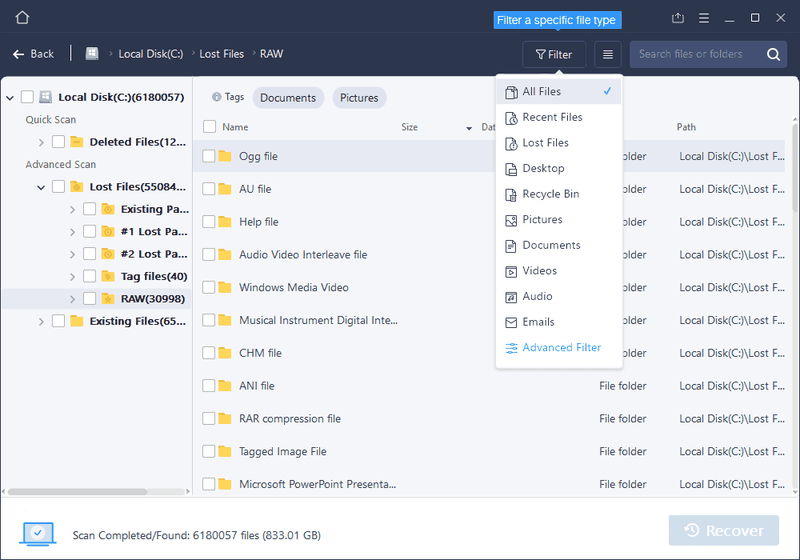 Chờ cho đến khi quá trình quét hoàn tất. Sau đó, chọn các tập tin bạn muốn khôi phục. Để xác định vị trí dữ liệu nhanh hơn, hãy sử dụng thanh tìm kiếm hoặc bộ lọc để tìm kiếm các tệp cụ thể. Để kiểm tra một tập tin, nháy đúp vào mục để xem trước nội dung của nó.