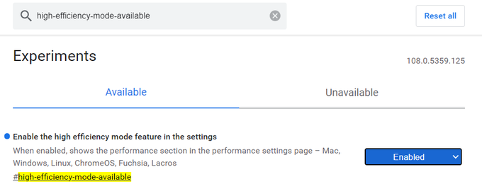 Tiếp theo, điền từ khóa "high efficiency mode" vào khung tìm kiếm ở phía trên, tùy chọn "Enable the high efficiency mode feature in the settings" sẽ được hiển thị ở bên dưới. Bạn chuyển tùy chọn từ "Default" sang "Enabled" tương tự như đã tiến hành ở trên.