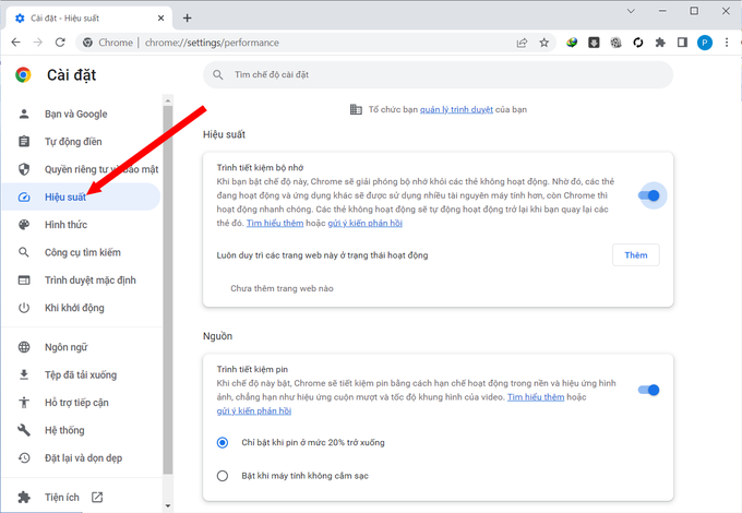 - Tại giao diện hiện ra tiếp theo, bạn chọn mục "Hiệu suất" (Performance) ở menu bên trái. Bây giờ, bạn có thể kích hoạt 2 tính năng "Trình tiết kiệm bộ nhớ" và "Trình tiết kiệm pin" trên trình duyệt Chrome.