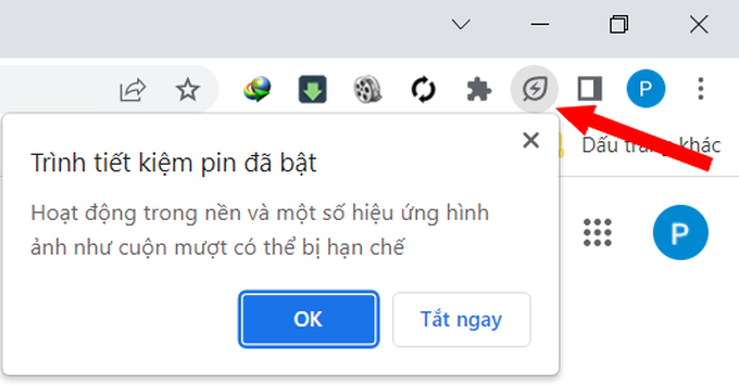 Mỗi khi chế độ tiết kiệm pin trên Chrome được kích hoạt, một biểu tượng nhỏ trên trình duyệt web sẽ được xuất hiện để thông báo cho người dùng được biết. Bạn có thể nhấn vào biểu tượng này để tắt chế độ tiết kiệm pin, nhằm khai thác hết các tính năng trên trình duyệt Chrome nếu muốn.