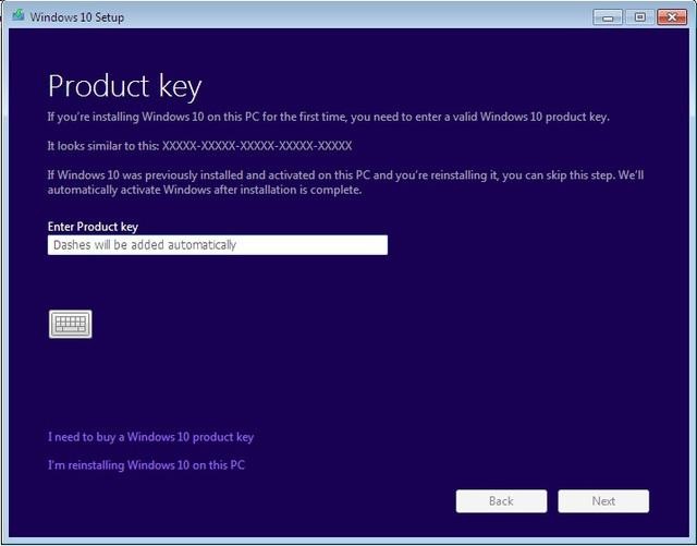 - Sau khi quá trình download bản cài đặt Windows 10 kết thúc, tiếp tục nhấn "Next" ở các bước tiếp theo để tiếp tục. Khi xuất hiện hộp thoại yêu cầu điền mã bản quyền của Windows (như hình minh họa bên dưới), bạn có thể sử dụng mã bản quyền của Windows 7 để điền vào hộp thoại, hoặc nhấn vào tùy chọn "I'm reinstalling Windows 10 on this PC" để bỏ qua bước này.