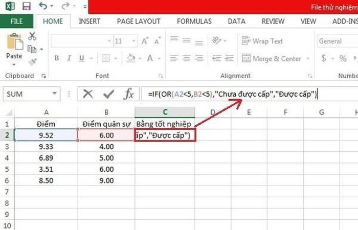 Điều kiện ở đây là cả điểm tốt nghiệp lẫn điểm quân sự, không điểm nào được dưới điểm 5. Vì thế chúng ta sẽ phải lồng ghép hàm AND vào mệnh đề điều kiện hàm IF trong ô C2 để đảm bảo phải thỏa mãn cả 2 điều kiện thành phần như sau: