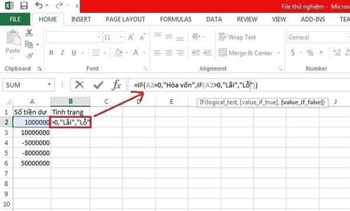 Như trên có nghĩa là nếu mệnh đề điều kiện 1 sai thì Excel sẽ xét tiếp đến mệnh đề điều kiện 2. Ví dụ cho trường hợp sử dụng hàm IF có nhiều điều kiện có thể là khi chúng ta có bảng kê số tiền cân đối thu chi từng ngày ở cột A và muốn cột B tự động xếp loại xem ngày đó lỗ hay lãi.
