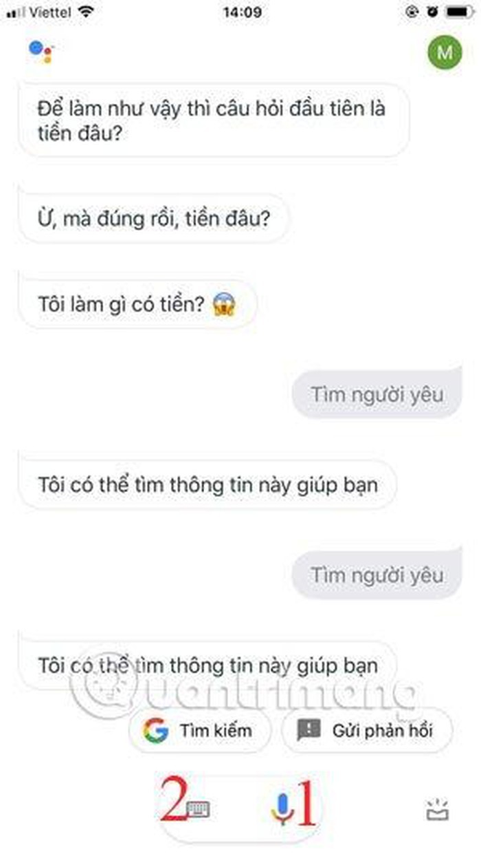 Giờ thì bạn có thể trò chuyện thoải mái với trợ lý ảo Google trên iPhone, hoặc nhờ Google Assistant mở ứng dụng, cài đặt hay thực hiện các tác vụ đơn giản khác trên thiết bị của mình. Mỗi lần ra lệnh bạn hãy bấm vào biểu tượng micro (1) hoặc gõ câu lệnh bằng bàn phím (2).