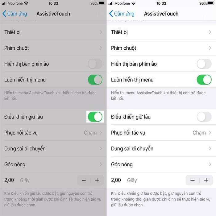 Bạn chọn tắt Điều khiển giữ lâu, ngay lập tức, chấm đen trên màn hình sẽ biến mất.