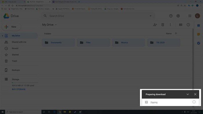 Sau khi download, Google sẽ nén các tập tin của bạn lại để chuẩn bị tải xuống. Lúc này, phía bên phải góc dưới màn hình sẽ hiện ra khung theo dõi quá trình nén các tập tin của bạn.