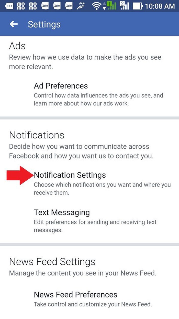 Nếu muốn tắt thông báo Facebook một cách toàn diện hơn thì trên điện thoại Android chúng ta có thể vào mục Settings => Notifications.