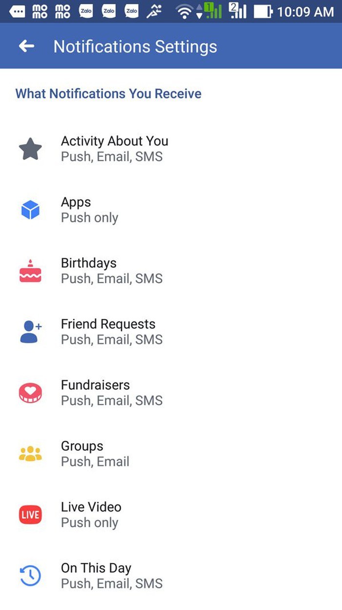 Để giảm bớt thông báo của Facebook trên điện thoại, chúng ta chỉ cần mở ứng dụng Facebook và vào mục Settings => Notification Settings. Sau đó chúng ta có thể chọn bất kỳ hoạt động nào cần điều chỉnh thông báo, ví dụ như khi có bài viết gắn thẻ bạn, có lời mời kết bạn, hay lời nhắc có sinh nhật trong ngày...