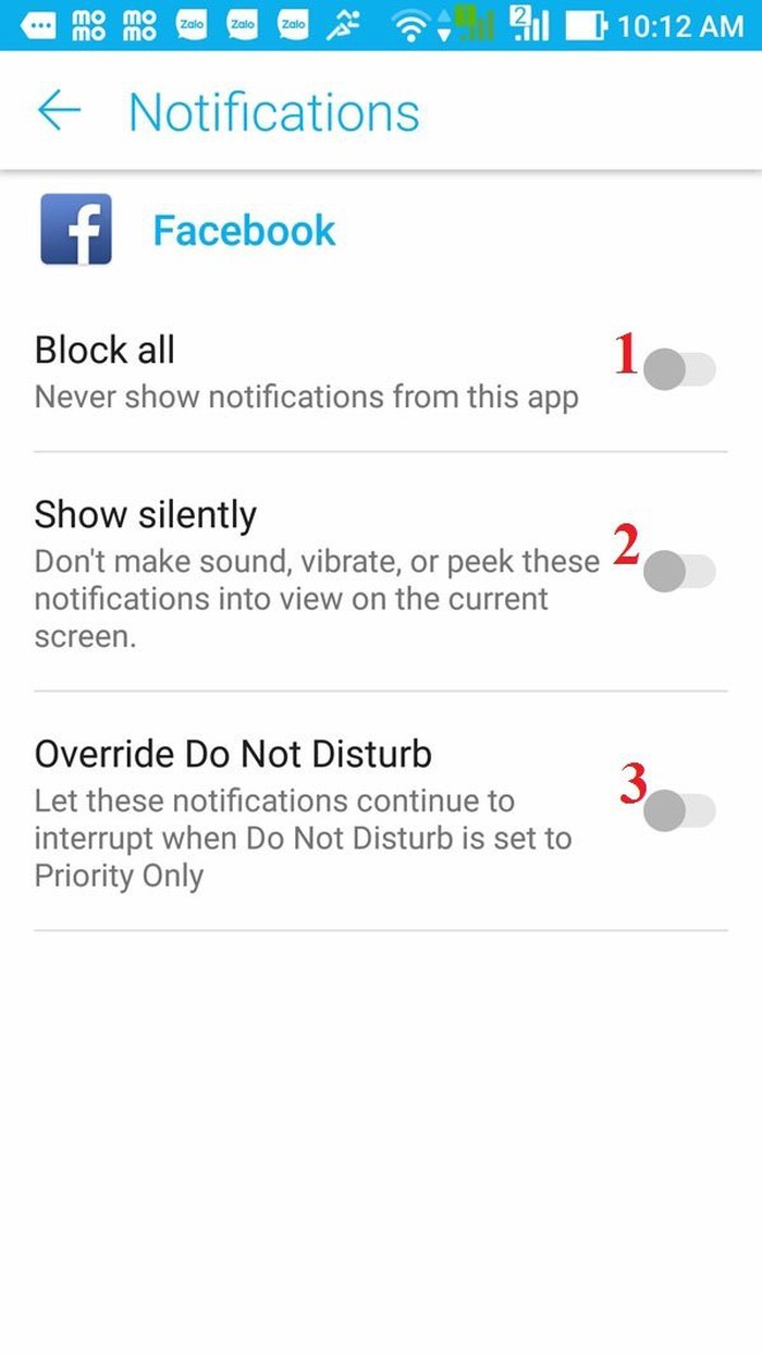 Hiện nay chúng ta có mấy lựa chọn, đó là tắt hoàn toàn thông báo từ Facebook (1), không chặn thông báo nhưng tắt âm thanh, rung, và việc xuất hiện trên màn hình của thông báo (2), hoặc chỉ mở cho thông báo quan trọng (3).