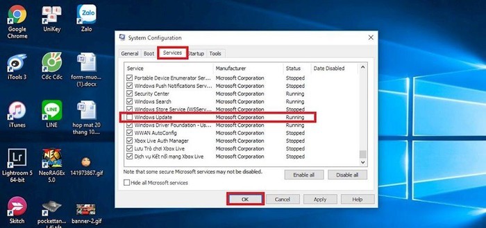Bây giờ các bạn chỉ cần chọn tab Service, bỏ chọn vào mục Windows Update để tắt cập nhật Windows 10. Sau đó bấm OK để hoàn tất.