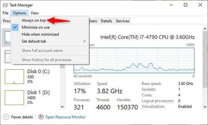Hơn nữa bạn có thể ghim cửa sổ này luôn ở trên cùng khi đang sử dụng máy. Cửa sổ được truy cập qua Task Manager. Nếu cần, hãy tham khảo hướng dẫn cụ thể bên dưới đây.