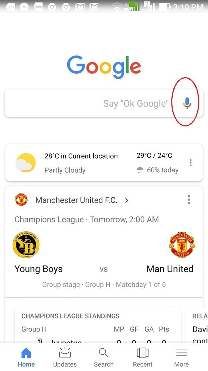 Sau đó để bắt đầu tìm kiếm bằng giọng nói, chúng ta mở ứng dụng Google và nói "Ok Google" hoặc nhấn vào biểu tượng micro.