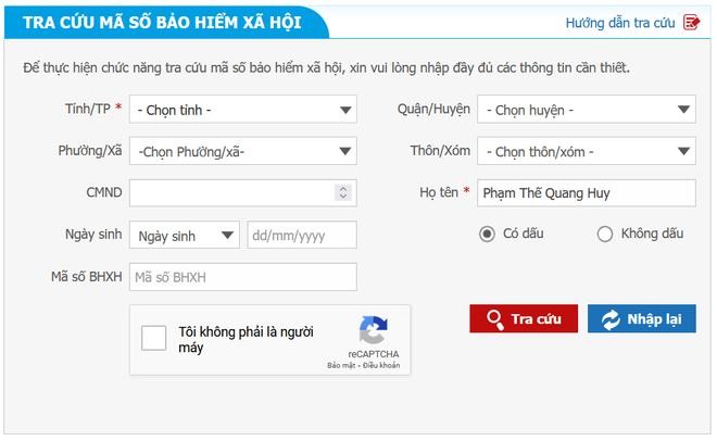 - Ngoài ra, bạn có thể truy cập vào trang web của Bảo hiểm Xã hội Việt Nam tại đây , điền thông tin cá nhân vào các khung trống (chỉ cần điền những khung nào có dấu *), đánh dấu vào tùy chọn "Tôi không phải là người máy" rồi nhấn nút "Tra cứu".