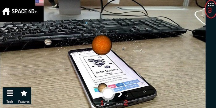 Hãy mở tấm card sưu tầm được trên một máy điện thoại khác (nên đặt nằm ngang xuống), rồi hướng camera của chiếc điện thoại vừa cài Space 4D+ vào đó để tạo hình nổi. Trong khi chiếu, chúng ta có thể xoay, zoom hình chiếu, hoặc chọn chụp ảnh (1) và quay lại (2) hình chiếu trong không gian xung quanh. Nếu muốn xem thông tin về vật thể trong hình chúng ta bấm biểu tượng số 3.