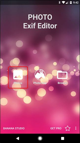 Sau khi cài và chạy Photo EXIF Editor, bạn sẽ thấy màn hình khởi động với 3 lựa chọn: "Photos", "Photo Map" và "Browse". Hãy nhấp vào mục "Photos":