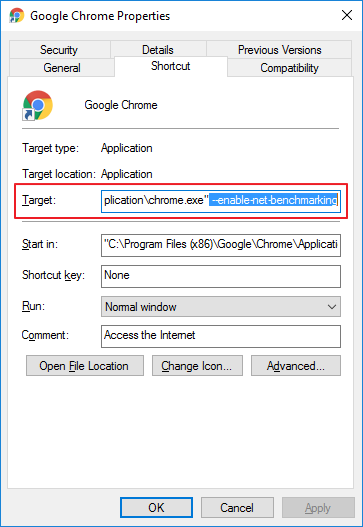 Tiếp theo, bạn thêm một ký tự khoảng trắng vào cuối đường dẫn tại ô Target. Sau cùng, bạn dán đoạn mã "--enable-net-benchmarking" (không có dấu nháy đôi) vào cuối đường dẫn và nhấn nút OK.