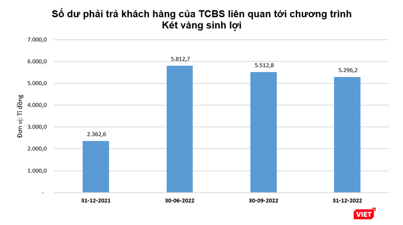 Trở lại với TCBS, tính đến thời điểm ngày 31/12/2022, số dư phải trả khách hàng cho hoạt động giao dịch chứng khoán được áp dụng chương trình ‘Két vàng sinh lợi’ ở công ty chứng khoán này đã lên tới 5.296,2 tỉ đồng, tăng 2.933,6 tỉ đồng so với đầu năm.