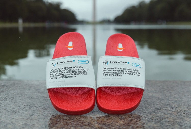 Năm 2013, ông Trump đã tweet để kêu gọi Tổng thống Barack Obama không tấn công Syria và nói rằng nếu tấn công Syria thì lãnh đạo nước Mỹ là ngu ngốc và nước Mỹ chẳng được lợi lộc gì. (thông điệp in trên dép bên trái). Vào tháng 4 năm 2017, Trump đã tấn công Syria và đăng tải dòng tweet chúc mừng chiến dịch (dép bên phải)