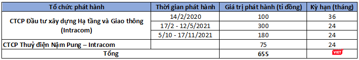 Cụ thể, tháng 2/2020, Intracom đã phát hành thành công 100 tỉ đồng trái phiếu kỳ hạn 36 tháng, lãi suất áp dụng cho hai kỳ tính lãi đầu tiên là 10%/năm.