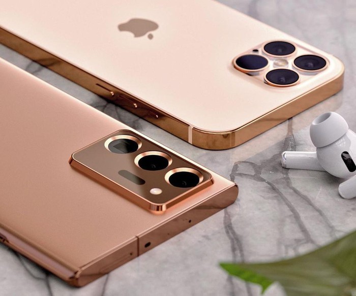 Trong bản dựng này, cả Galaxy Note20 Ultra và iPhone 12 Pro đều có 4 camera sau. Tuy nhiên, smartphone của Samsung có cụm camera hình chữ nhật, to và hầm hố hơn so với iPhone mới. Ảnh: Smazizg.