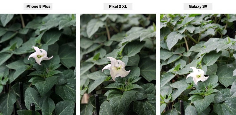 Pixel 2 XL cũng cho ra tấm ảnh rất đẹp. Màu xanh không đậm bằng iPhone 8 Plus nhưng chúng ta có thể thấy được những giọt sương trên bông hoa. Một lần nữa, người dùng không cần phải di chuyển để có thể chụp được tấm ảnh đẹp. Trong khi với iPhone và Samsung Galaxy, người dùng cần di chuyển chọn khoảng cách để bắt nét vật thể.