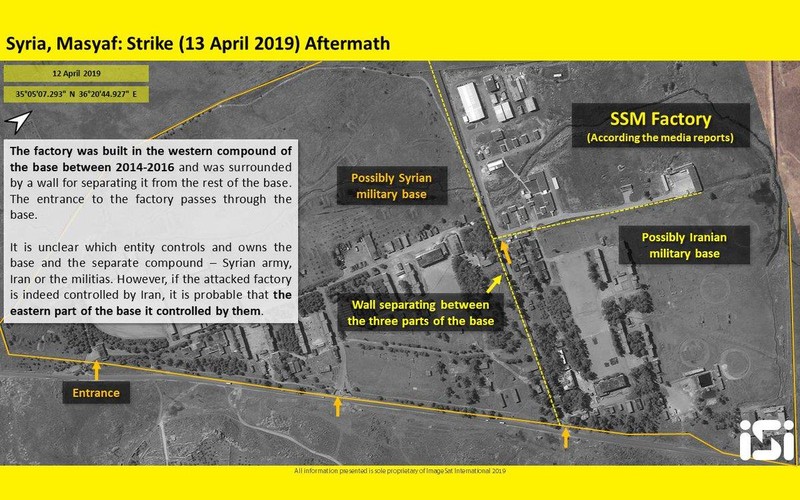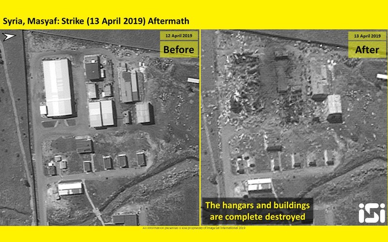 Theo những bức ảnh vệ tinh của ISI, một nhà chứa máy bay lớn và ba tòa nhà gần đó bị phá hủy trong cuộc tấn công vào căn cứ, gần thành phố Masyaf phía tây tỉnh Hama.