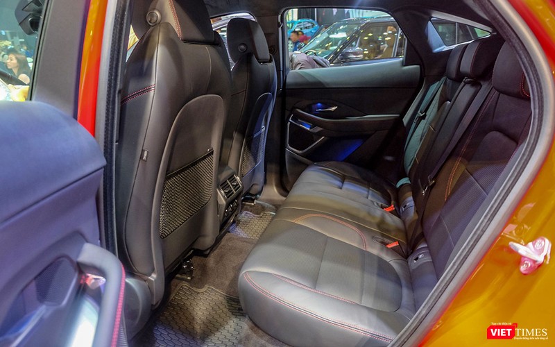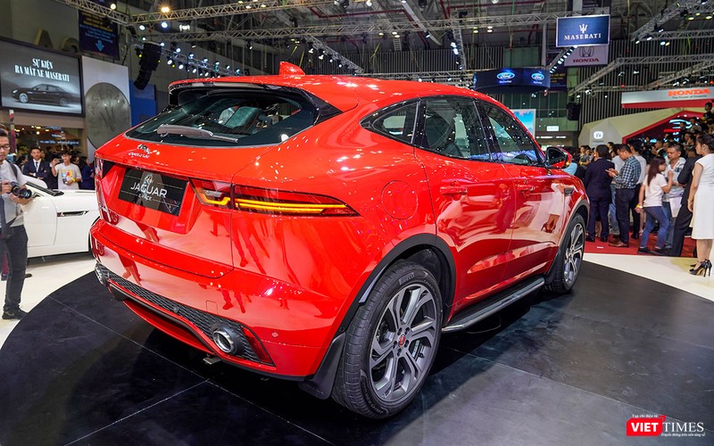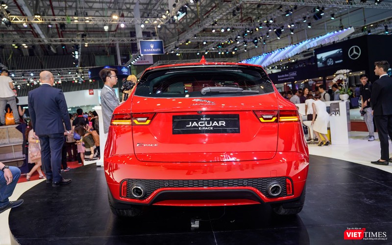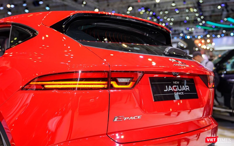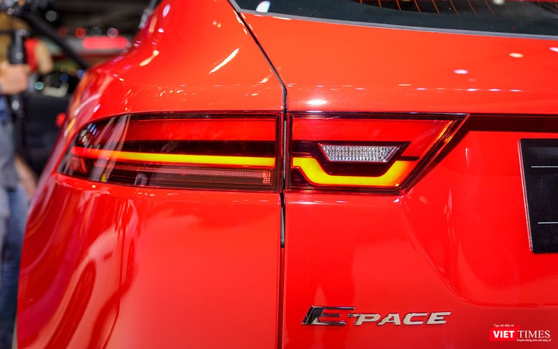 Trong khi ở phía sau, Jaguar E-PACE khó có thể bị nhầm lẫn với người anh F-PACE khi có cụm đèn hậu LED tạo hình vuông thành sắc cạnh hơn. Ốp cản sau với bộ ống xả kép đối xứng trông cũng thể thao hơn so F-PACE.