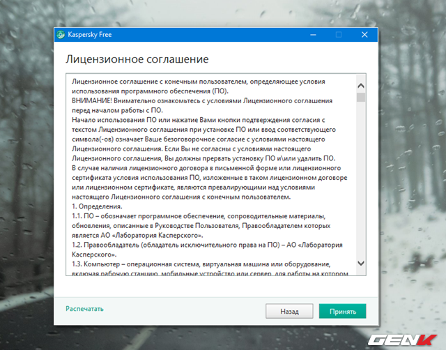 Vì hiện tại Kaspersky Free Antivirus chỉ mới được phát hành chính thức tại Nga và Ukraina nên ngôn ngữ mặc định sẽ là tiếng Nga, do đó bảng thông tin điều khoản sử dụng cũng là tiếng Nga nốt.