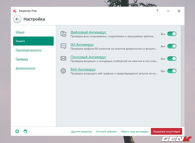 Khi đã xong, Kaspersky Free Antivirus sẽ tiến hành tối ưu lại dữ liệu cài đặt và giao diện Kaspersky Free Antivirus sẽ hiển thị. Do đã nói trước đó là hiện tại Kaspersky Free Antivirus chỉ mới được phát hành chính thức tại Nga và Ukraina nên ngôn ngữ mặc định sẽ là tiếng Nga. Mặc dù đã kiểm tra kĩ trong phần cài đặt nhưng bạn sẽ không thấy bất kỳ tùy chọn chuyển đổi ngôn ngữ sang tiếng Anh.