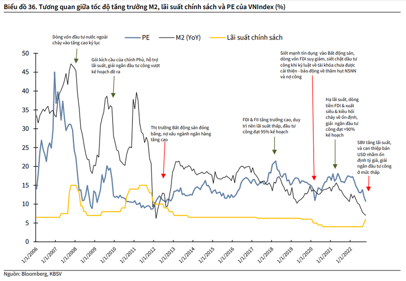 KBSV cho rằng cung tiền M2 là yếu tố có tác động mạnh lên diễn biến thị trường chứng khoán (TTCK). Các giai đoạn M2 tăng mạnh, đi kèm với mặt bằng lãi suất ở mức thấp và dòng tiền dồi dào chảy vào TTCK giúp VN-Index tăng điểm và ngược lại.